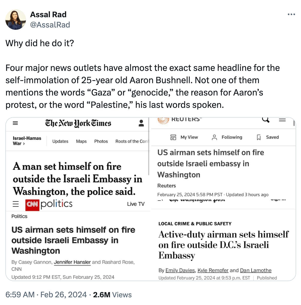 Aaron Bushnell was a member of the US Airforce. On Sunday afternoon, he self-immolated in front of the Israeli embassy in Washington “in an act of extreme protest” against the genocide of the Palestinian people: “I will not be complicit in genocide.”
